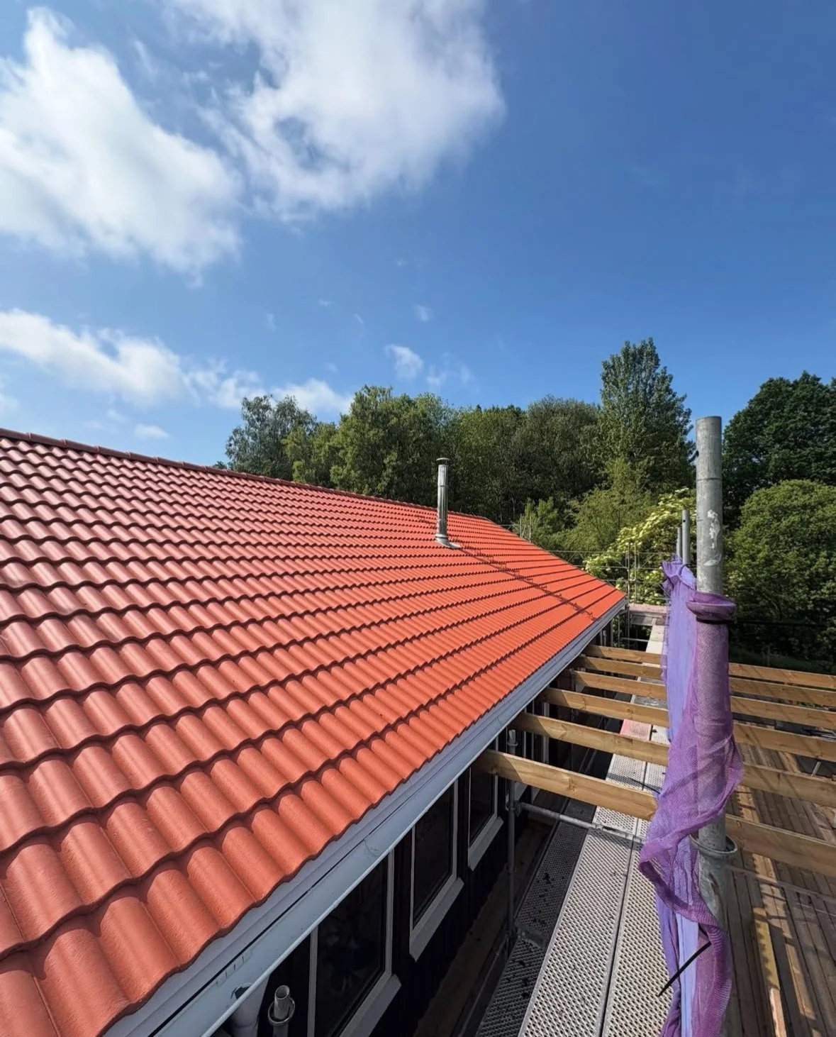 Vi fick förtroendet att fräscha upp ett äldre tak i Vallda. Det gamla takpannetaket revs helt, där vi tog bort takpannor, läkt och takpapp för att kunna bygga upp taket på nytt från grunden.